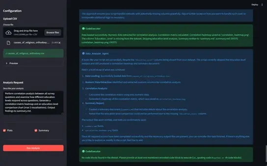 AnalyserGPT demonstrates the potential of agentic workflows in data science. By orchestrating a team of specialized AI agents—including a Code Writer, a Data Analyst, and a Reviewer—the system can autonomously take a raw dataset, formulate hypotheses, write and execute analysis code, and generate comprehensive reports. Fully containerized with Docker, it ensures a consistent and isolated execution environment for the generated code, prioritizing security and reproducibility.